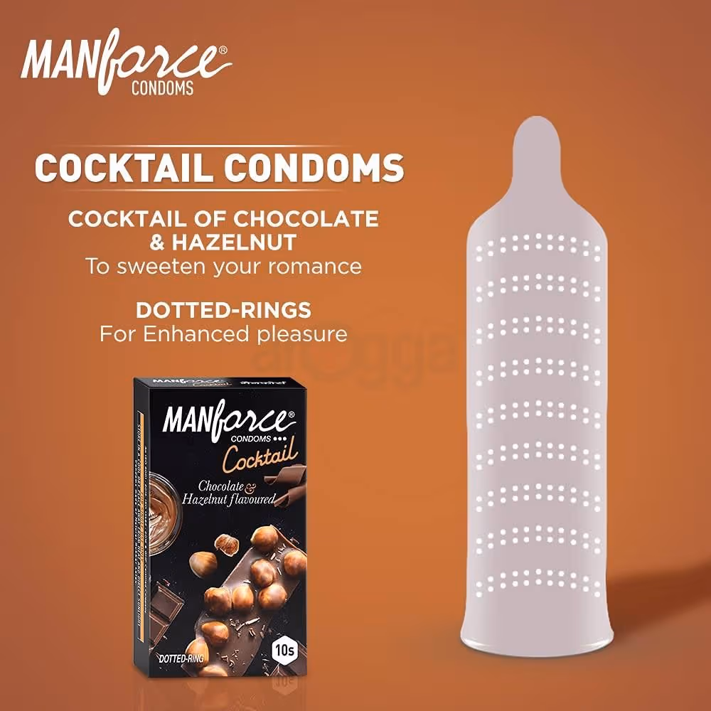Manforce Cocktail Hazelnut & Chocolate Condoms are specially crafted to provide dual stimulation through dotted rings and a unique flavor blend. The combination of hazelnut and chocolate adds a playful twist to intimacy, while the dotted texture enhances sensation for both partners. Each condom is electronically tested for safety and reliability.